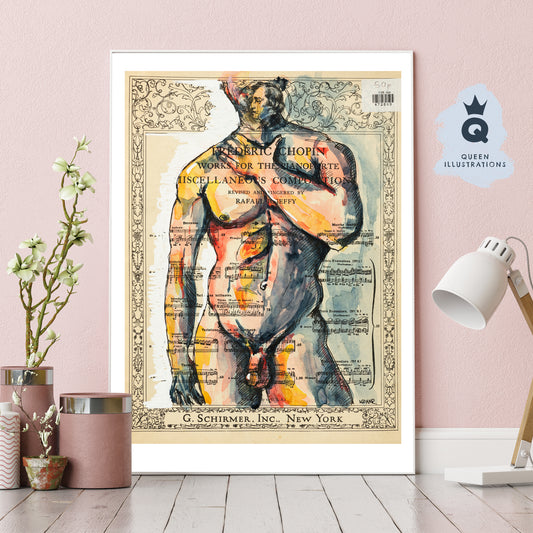 "Frederic Chopin", watercolour painting on a vintage music sheet - Homoerotic Art Print