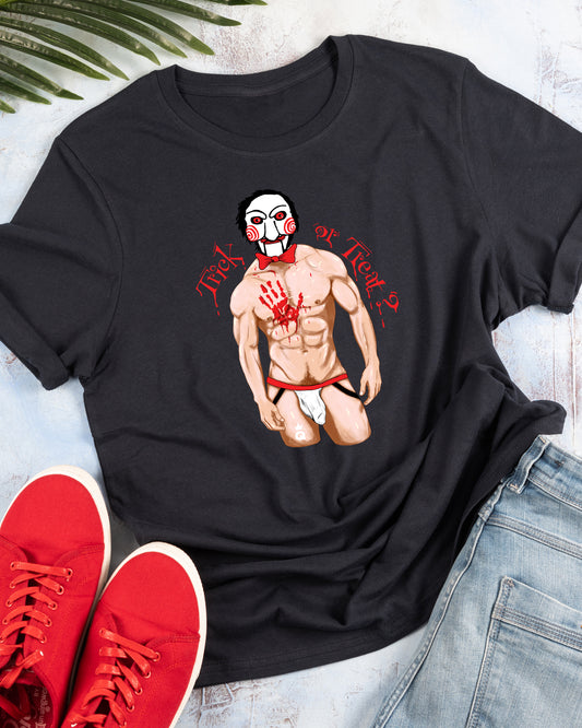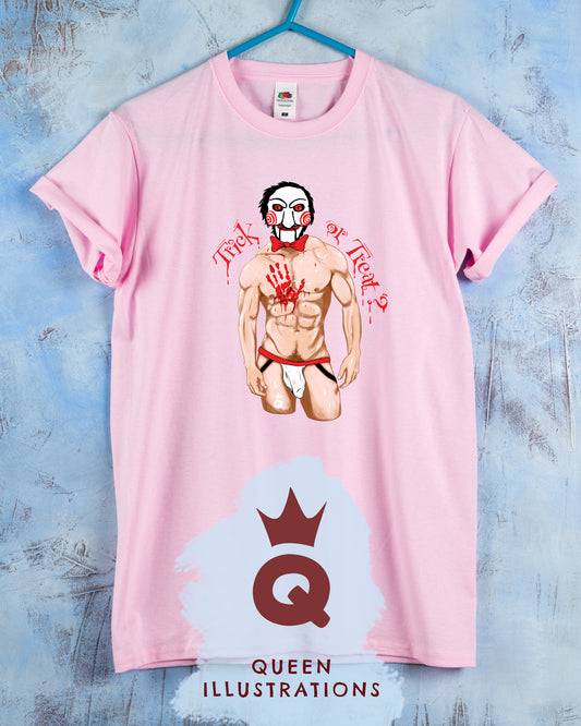 • cute gay pink t-shirt for Halloween, gay horror, Billy the puppet