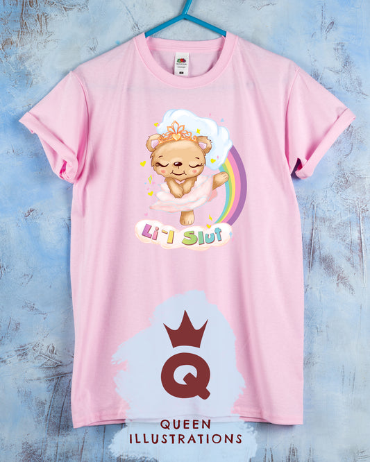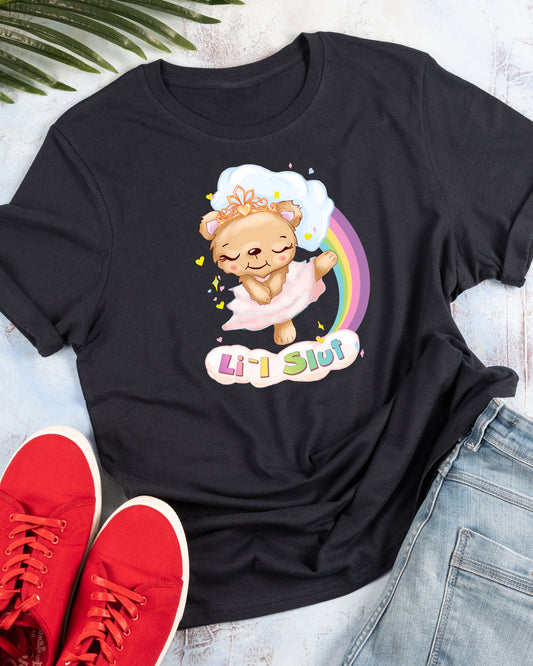 • gay T-shirt, pink t-shirt with a cute kawaii bear dancing with rainbow, little slut
