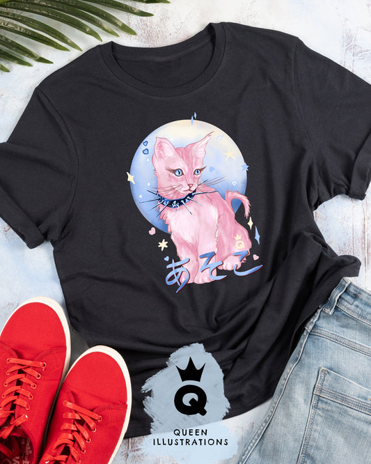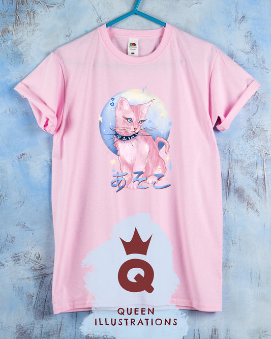 PUSSY in Japanese, gay kawaii T-shirt in pink, cute kitten, perfect for pride or as gift